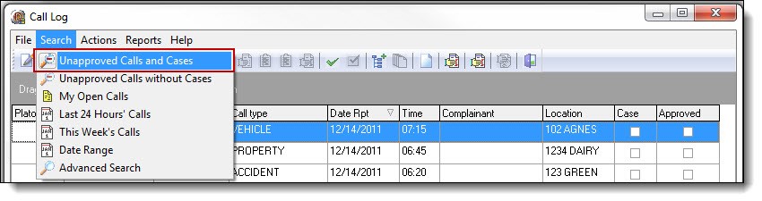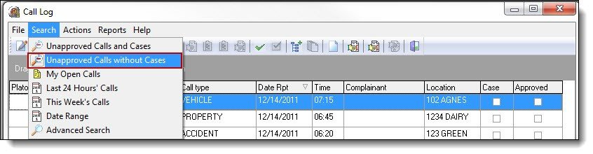 3. There are seven (7) search options built into Call Log. The first option is “Unapproved Calls and Cases”. This search will display all calls and cases that have not been approved by a supervisor from within the Call Log module. To access this search, select “Unapproved Calls and Cases” from the Search drop down list.