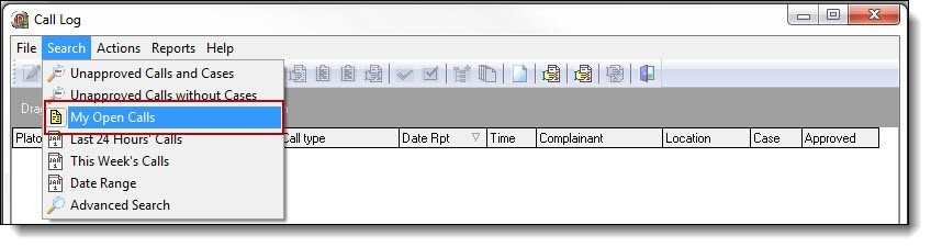 5. The third option is “My Open Calls”. This search will only display calls with no cleared date/time for the logged in user. To access this search, select “My Open Calls” from the Search drop down list.