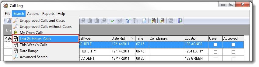 6. The fourth option is “Last 24 Hours Calls”. This search will only display calls with a date/time reported falling within the last 24 hours. To access this search, select “Last 24 Hours Calls “ from the Search drop down list.