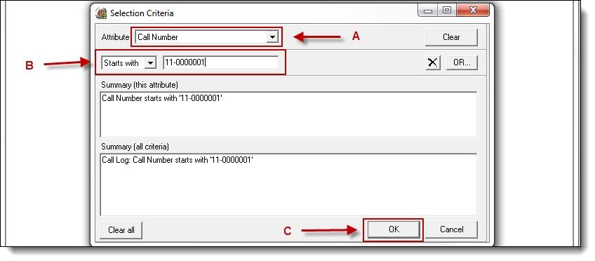 11. Select a choice from the Attribute drop down list (A), enter the search criteria (B), and then click the “OK” button ( C ).