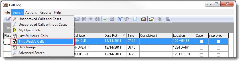 7. The fifth option is “This Weeks Calls”. This search will display calls within seven (7) days of the current date/time. To access this search, select “ This Weeks Calls “ from the Search drop down list.