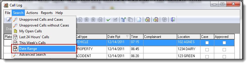 8. The sixth option is “Date Range”. This search will display calls within the date/time range entered by the user. To access this search, select “ This Weeks Calls “ from the Search drop down list.