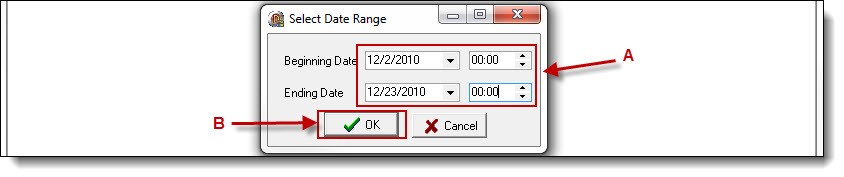 9. Enter the date and time information (A), and then click the “OK” button (B).