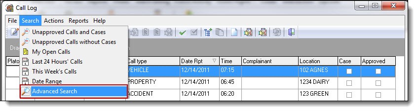 10. The seventh and last option is “Advanced Search”. This search will display calls meeting the search criteria entered by the user. To access this search, select “ Advanced Search “ from the Search drop down list.