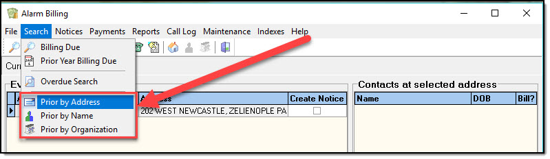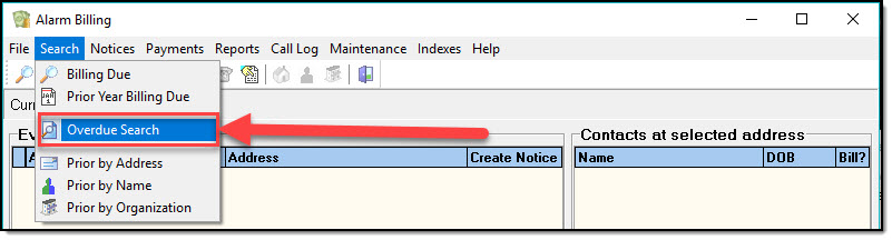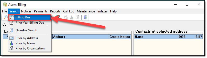 To search for current billing events that may be due to generate a Warning, or Fine letter, select ‘Billing Due’ from the Search drop down. This is the same as what the Alarm Billing opens by default, on launch.