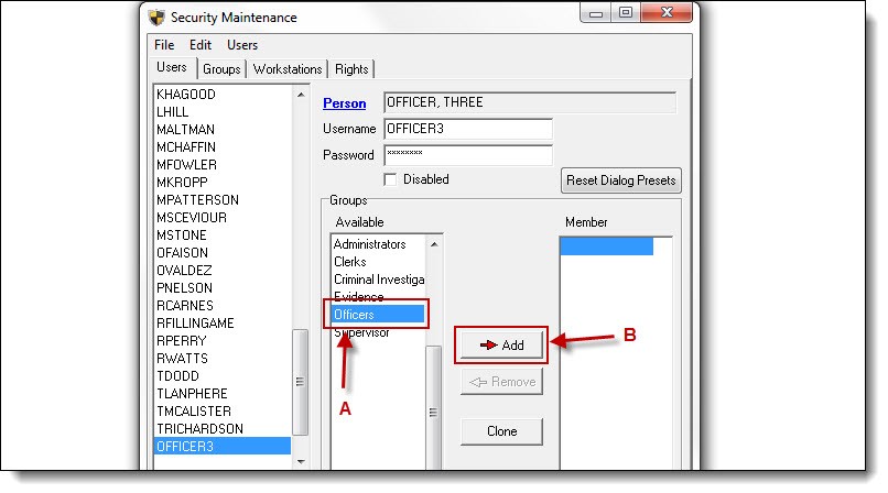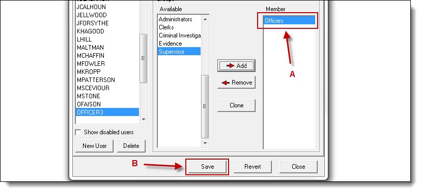 2. The group will now show in the Member column (A). Click the “Save” button (B) to save the new officer’s login details.