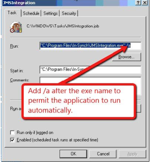 8. Create a scheduled task to run jmsintegration.exe once a day. After you create the task right click on the task in schedule tasks and chose properties. Once properties is displayed please add “ /a “after the exe as shown in the picture below. This flag lets the application run automatically in the background.