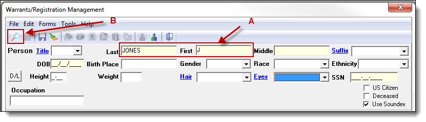 2. Enter part of the person’s last name, first name or both (A), and then click the “Search” button (B).