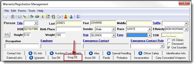 The Sex, Drug and Arson offense tabs can be found next to the Warrants tab in the Warrants and Registration module. All three tabs use the same instructions for data entry. For this example, we will create a drug offense registration record.