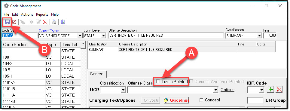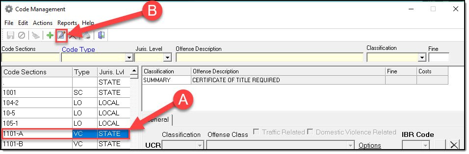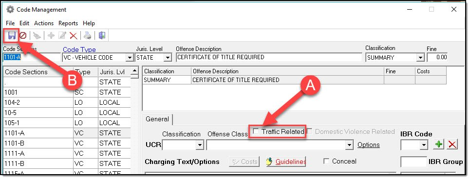 1. To set a Crimes Code to Traffic Related, search and select the code (A), and then click the ‘Edit’ button (B).