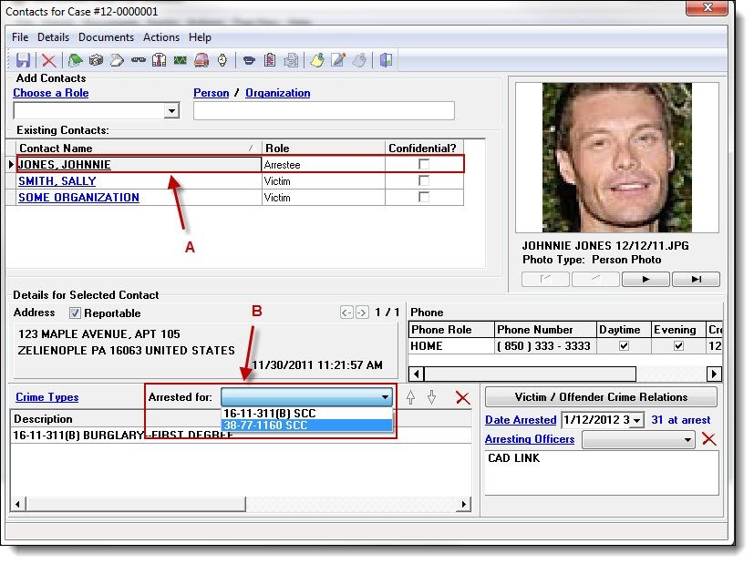 1. Any contact with the role of Arrestee, Suspect, or Victim must be associated with at least one crimes code. Highlight the contact (A), and then select a crimes code from the drop down list (B).