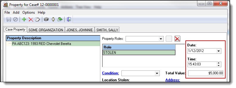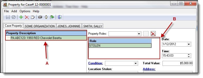 1. For crimes requiring property, the property should be entered under the Case Property tab (A). Each piece of property should have at least one property role attached (B).