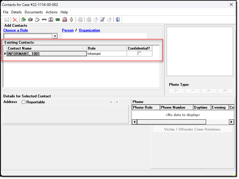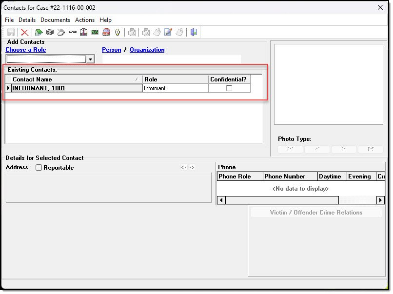 5. The informant will be listed under the “Contacts” window in the case.