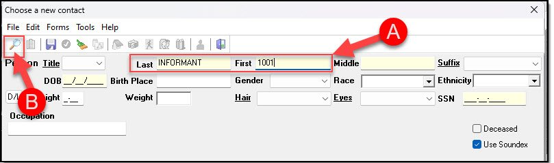 2. From the Person window, enter “INFORMANT” as the last name, the informant number (1001) as the first name (A), and then click the “Search” button. (B)