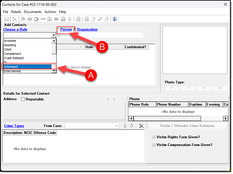 1. For an informant to properly display in a call or case, the role of “Informant” must be used. From the Contacts window, select “Informant” in the role drop-down list (A), and then click the blue word “Person” (B).