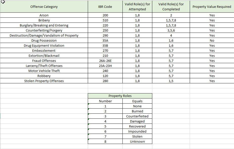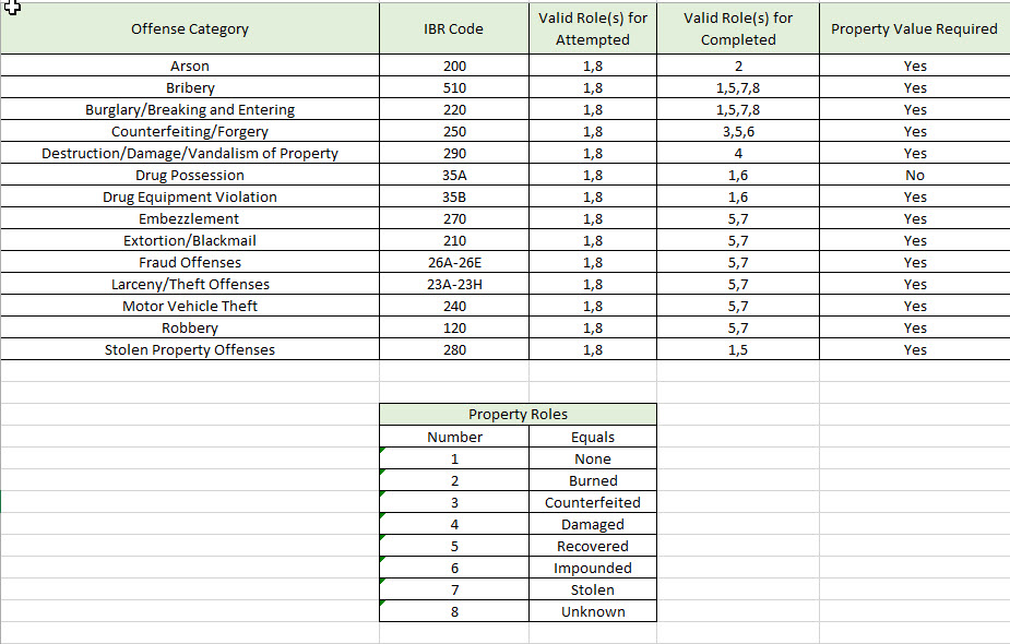 The following table illustrates the FBI property offense categories and the valid property roles for each of them. The roles are shown as numbers 1 – 8 with their mappings illustrated in the table below.