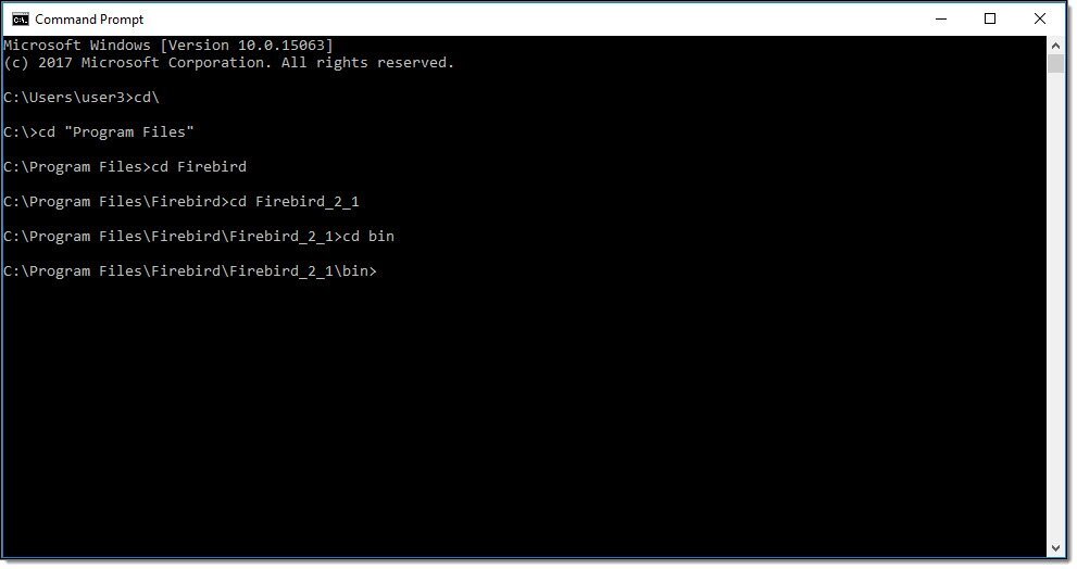 Open a new CMD window and navigate to the bin directory of the Firebird installation. In this example, the bin directory is located: “C:\Program Files\Firebird\Firebird_2_1\bin”