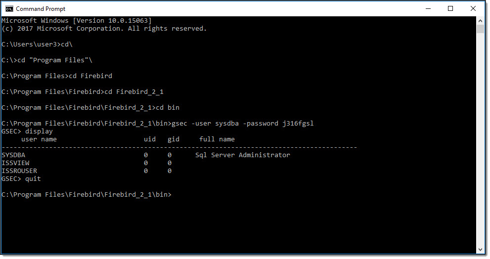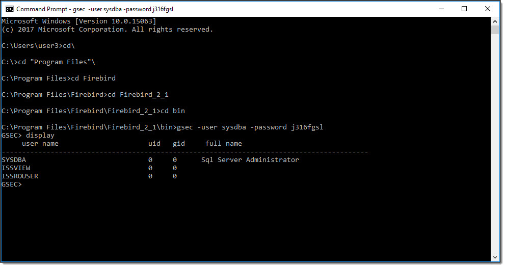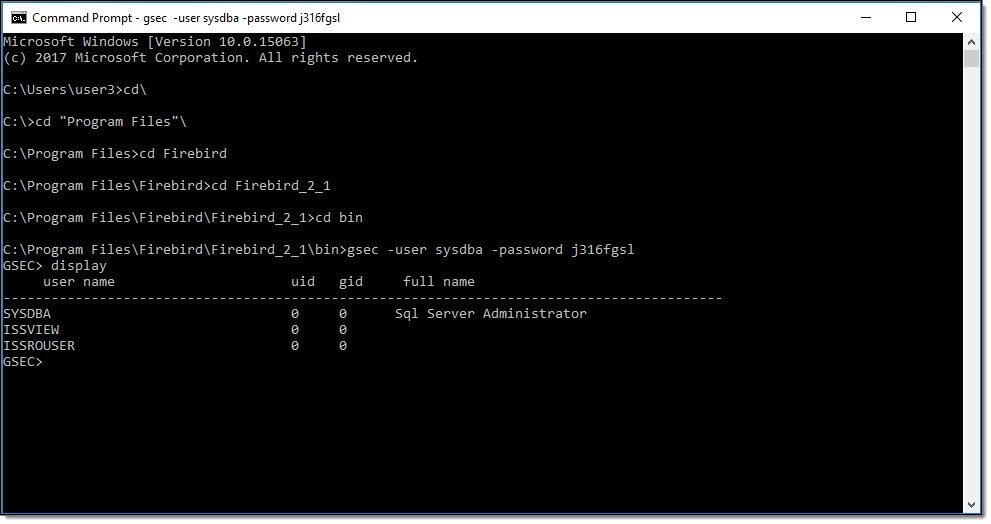 Firebird’s GSEC utility has the ability to display all accounts (users) stored in the security2.fdb. To view this list, follow the steps below: