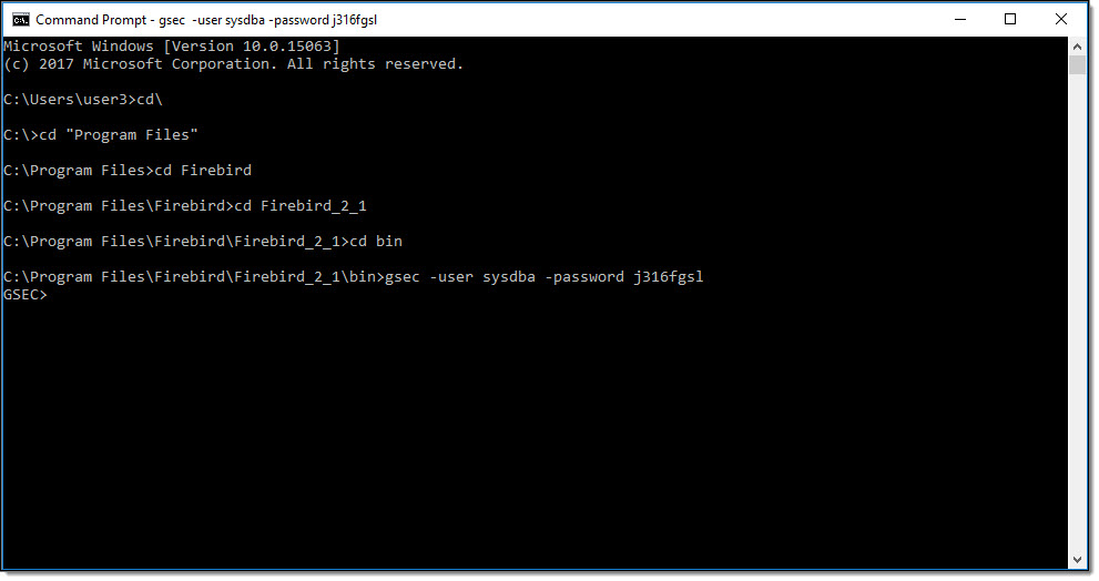 Type the following command (without quotes): “gsec -user sysdba -password j316fgsl” and then press the “Enter” key to start the GSEC Utility.