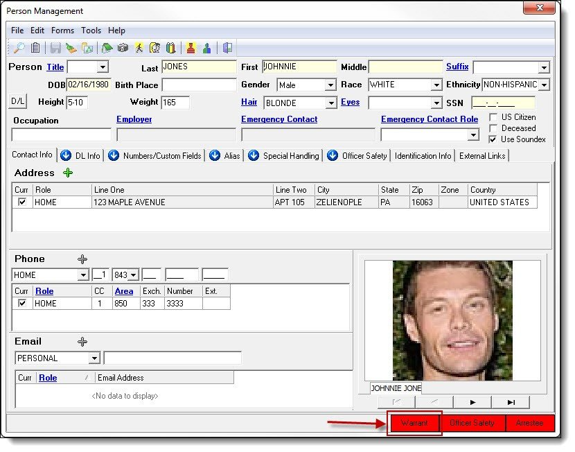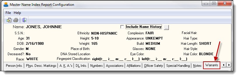 4. The Master Name Index can have various tabs for each type of the previous contact with the person. Click on the tab called Warrants.